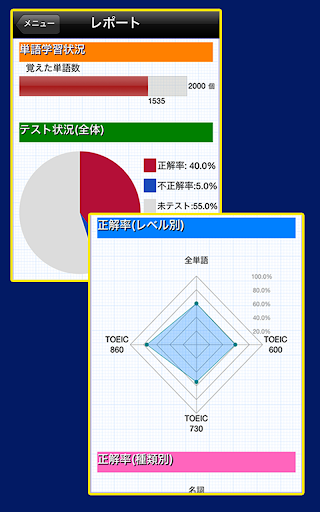 ・単語レベル及び単語種類別での正解率もチャートで表示され、学習効果を多方面でわかるようなっています。