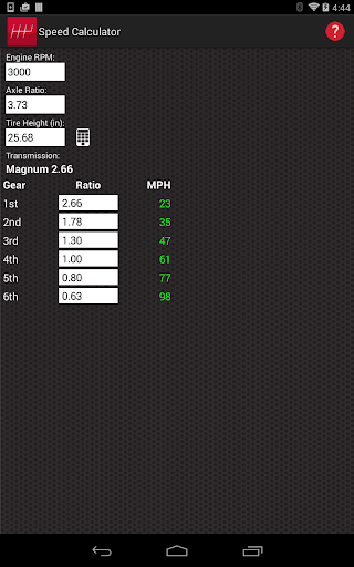 • Vehicle Speed Calculator: Interactively determine your vehicle’s speed in any gear and any engine RPM for best performance. You can alter the axle gear ratio, the transmission gear ratio and tire size to see the impact in real-time. As an added bonus, the calculator doubles as a Gear Ratio Calculator.