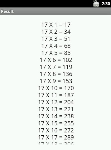 This application allows you to generate multiplication tables of any number you want and up to the any specified limit.