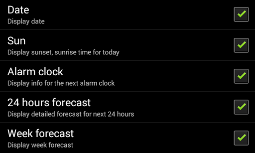 - weather now, forecast for one day each 6 hour and forecast on next week: temperature, wind speed and direction, pressure, clouds, precipitation and if sky is clear - moon phase, Units for temperature, speed and pressure are adjustable.