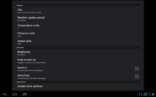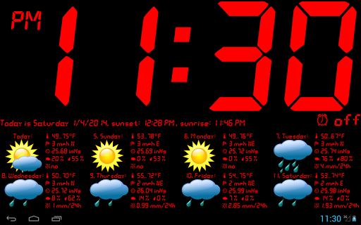 Nowadays wall clock are quite stupid, but price for them is a little bit less that price for tablet PC. And weather station is expensive. So, why do you need to buy stupid clock or expensive weather station when you can take this application and the cheapest table pc or old useless one and get smart clock: