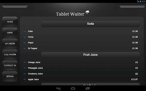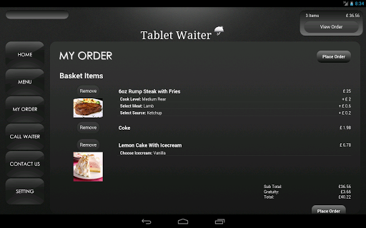 Tablet Waiter is an all in one solution for your bar or restaurant. It allows your customers to place orders from their table which automatically gets sent to the kitchen without the need for waiters. Customers can also call the waiter with the touch of a button and view their outstanding bill.