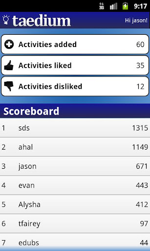 Ever sat around with some friends and said, "I don't know, what do you want to do"? Taedium aims to cure boredom by recommending user submitted activities. Vote on which activities you like best, or share your favourite things to do with the rest of the world. Whether it be an awesome bar downtown or a simple game to be played on a lazy Sunday afternoon.