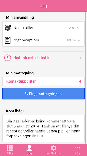 p-pillret på ett tryggt och säkert sätt. Du kan enkelt ställa in automatiska påminnelser som talar om när det är dags att ta ditt piller, beställa recept och hämta nya piller. Dessutom kan du notera eventuella blödningar, får svar på frågor och läsa mer om ditt p-piller.