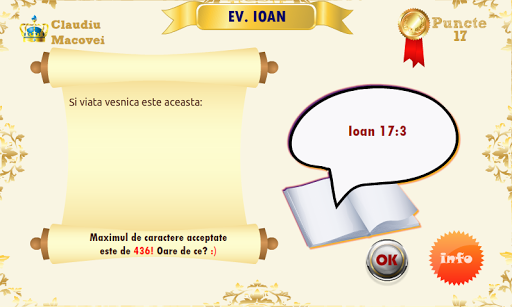 Aplicaţie biblică care aduce cu ea modalităţi de testare a cunoştinţelor biblice. Este inspirată după concursul biblic naţional cu acelaşi nume. Cuprinde 5 modalităţi de răspuns, prin Adevărat sau Fals, raspuns unic din 3, asocierea a câte două expresii, răspuns text la spaţiile punctate, răspuns cu 1,2, sau 3 variante corecte precum şi verset de memorat.
