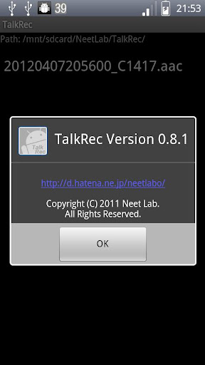 ※ 保存されたファイルはSDカード内の/NeetLab/TalkRec/フォルダ内に記録されます。