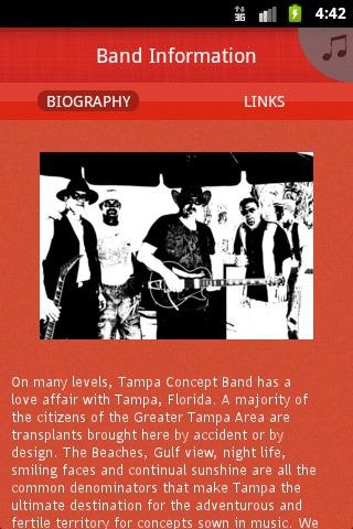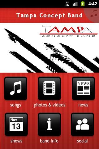 Tampa Concept Band, based out of Tampa, Florida invites you to discover the incredible rock ballads and songs inspired by the city, it's lovely beaches, night life, smiling faces and continual sunshine. Do this through the new official Tampa Concept Band Mobile App! Stream our music, see pictures, check out our bio, and share it all with your friends. Stay connected for the latest updates from Tampa Concept Band on your mobile device with our free Mobile App.