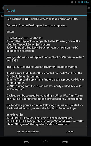 Tap Lock requires the Tap Lock Server to be installed and running on a bluetooth enabled PC, such as a laptop. The Tap Lock Server is included with this app along with instructions to set it up.