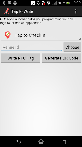 The “Tap to Write” app allows you to write data to an NFC tag by a simple tap of the NFC Tag. It also allows to generate a QR code for the same data. The data is encrypted and also write protected.