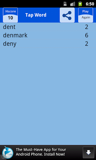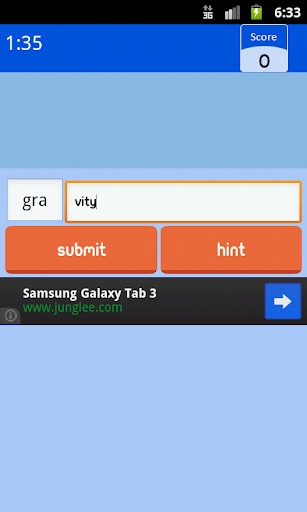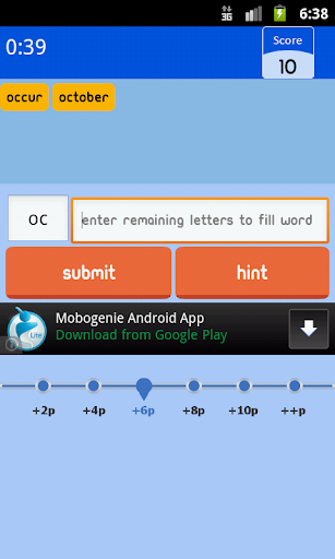 This app is more useful for people to know about more words. This app creates more enthusiasm while playing it. It checks your word power i.e how many words can you create with in two minutes of time. It provides first three letters of a word, you have to enter remaining characters and submit or click enter. For each correct answer points will be generated.