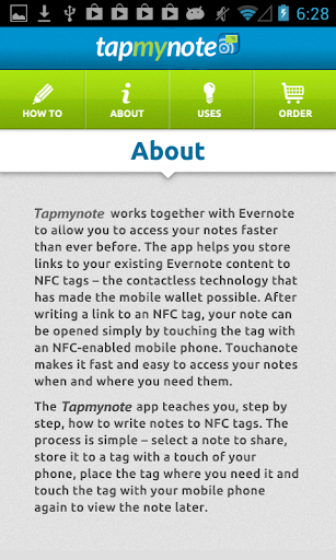 Tapmynote works together with Evernote to allow you to access your notes faster than ever before. The app helps you store links to your existing Evernote content to NFC tags – the contactless technology that has made the mobile wallet possible. After writing a link to an NFC tag, your note can be opened simply by touching the tag with an NFC-enabled mobile phone. Tapmynote makes it fast and easy to access your notes when and where you need them.