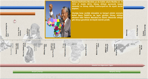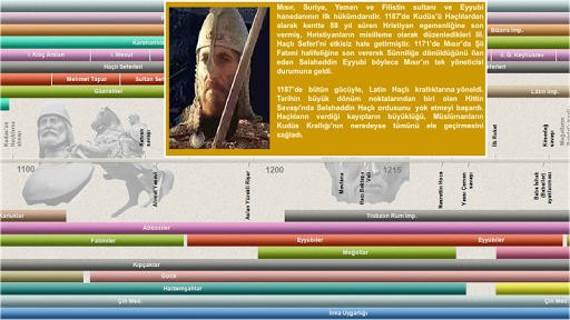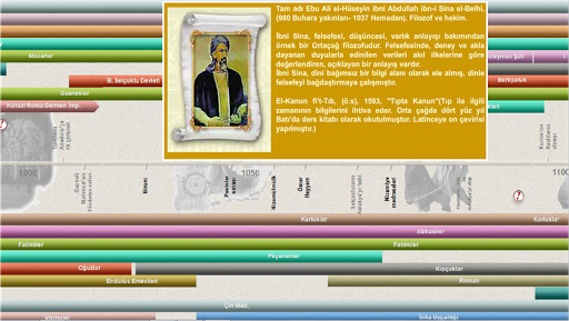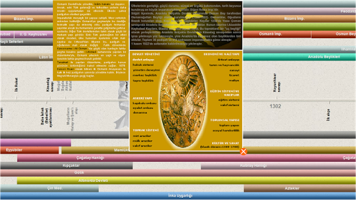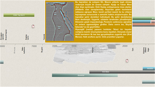M.Ö. 10.000 lerden günümüz 2014 yılı dahil tüm tarih ve kültür bilgilerini öğrenin. uygarlıkların ne zaman şadıklarını, ne zaman sona erdiklerini, aynı anda çağdaşlarınının bilgilerini eş zamanlı olarak kültürünüze ekleyin. Tüm sınavlarda yararlı olabilecek şekilde tasarlandığından, size bu konuda ne kadar yardımcı olduğunu görün. Şeritte yer alan döneme ait ünlem işaretine tıklayarak en ilginç bilgileri yalnızca siz edidin. kronolojiyi zorlayarak öğretme metodu güden bu çalışmanın şerit olarak gerçek uzunluğu 16 m. dir. her bilgi, uygarlık ya da olayda mutlaka resimlerle desteklenme yöntemi olduğunu unutmayın. Şeriti sadece sürüklemeniz yeterli. Tarihe merakınızın ne kadar gelişeceğine şahit olun.