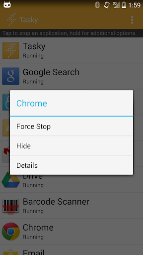Tasky displays running applications and allows you to stop them with a single click. Use a long press to access additional options for a running program.