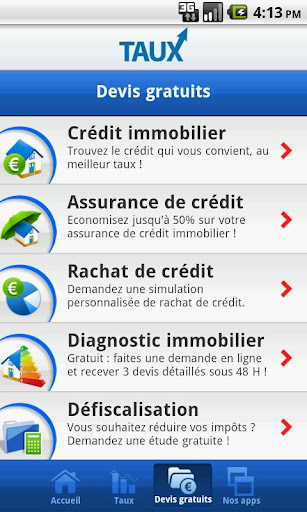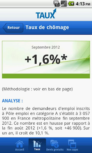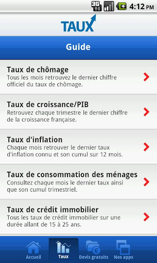 Avec l'application "Taux" vous dispsoez des derniers taux et indices mis à jours mensuellement : taux de chômage, PIB, inflation, consommation des ménages, crédit immobilier, assurance de crédit.