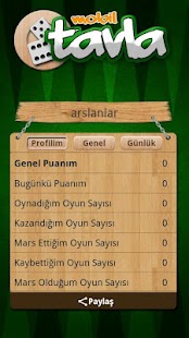 This page includes individual and general game statistics. In this section, you can see your own scores and ranking among all Mobil Tavla players. If you want, you can share your points and ranking with your friends.
