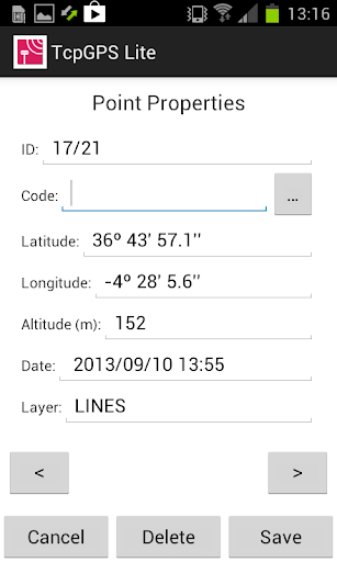 This application, installed on a mobile device with Android operating system, allows the user to make surveys using integrated GPS with its nominal precision, in a fast and easy way.