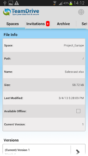 With the TeamDrive version management system (versioning), you have the option to go back to earlier versions of documents and to track all of the changes made by group members.