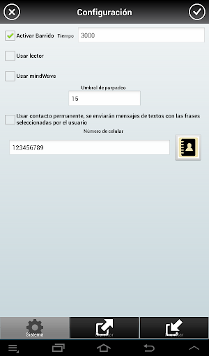 Barrido Automático: Al activarlo el sistema recorre las diferentes opciones de la categoría de manera automática, teniendo en cuenta el tiempo configurado para el usuario. Para seleccionar el usuario pulsa la pantalla o parpadea (con el uso en conjunto del dispositivo mindWave Mobile), de esta forma pueda navegar a través de las diferentes categorías con un único movimiento.