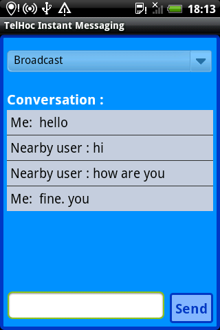 TelHoc Alpha is a peer to peer application that allows you to send Instant Messages and Push To Talk messages directly between phones, without the need for any cellular or mobile network, nor any WiFi Access Points.