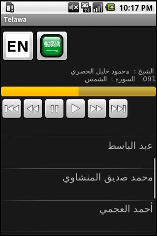 Seven reciters are available: Sheikh El Ghamidi, Sheikh Mahmoud Hossari, al-Sheikh Abd el Bassat Abd el Samad...