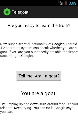 Google's brand-new Android 4.2 operating system contains a super-secret functionality that can check, in real-time, whether you are a normal human, or whether you are a goat. According to Google, those goats (and you might be one of them) are able to teleport!