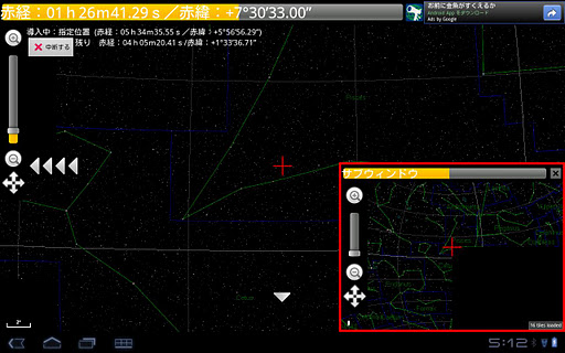 タブレット端末ではメイン画面とサブ画面の2画面表示し、同じ星座の拡大表示と全体の位置とを両方見たりすることが可能です。