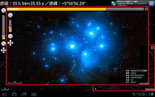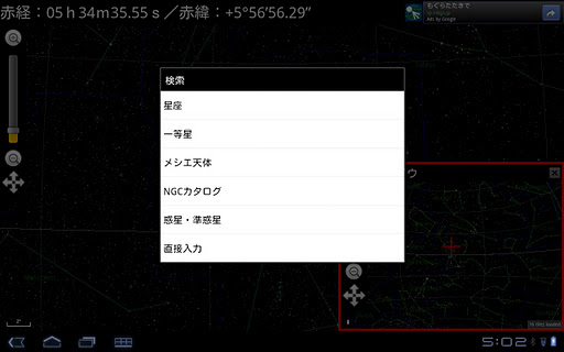 星座、一等星、メシエ天体、NGC天体及び惑星の現在位置を検索してその位置を表示する機能があり、更にその写真(惑星を除く)を表示することも可能です。更にWikipediaの情報を表示することも可能です(NGC天体を除く)