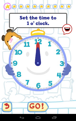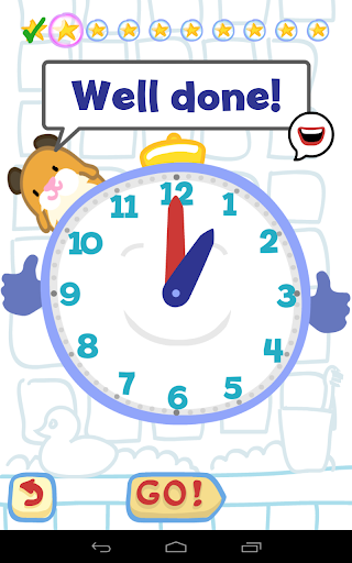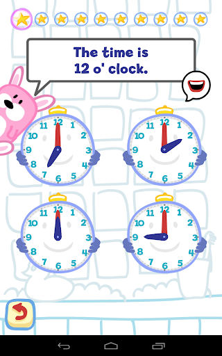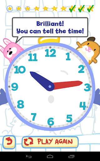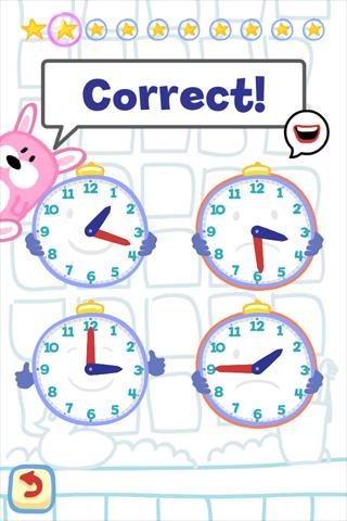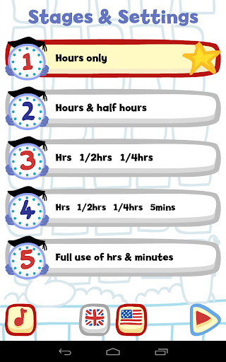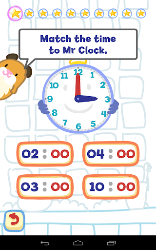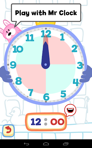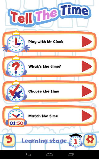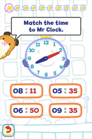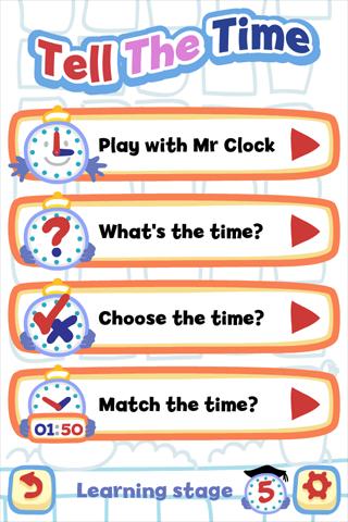 There are five learning stage levels ranging from just the first use of hour hands all the way up to full use of hours and minutes. At any time the child can also Play with Mr Clock which allows the child to move the clock hands with their fingers and hear the time played back to them.