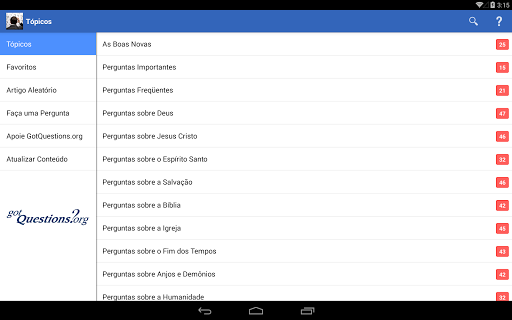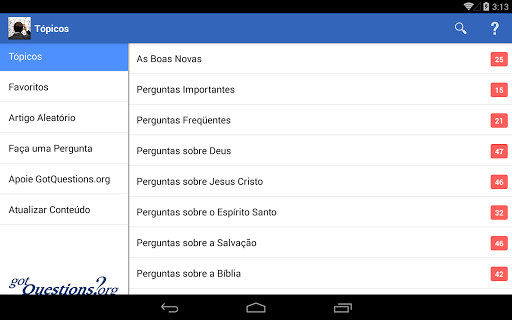 Este aplicativo é um mecanismo de busca integrado capaz de pesquisar mais de 1000 das nossas perguntas mais frequentes sobre a Bíblia, organizadas por assunto, e de selecionar artigos favoritos para facilitar o acesso futuro. Também pode baixar facilmente artigos novos/atualizados e, caso a resposta não já esteja disponível, oferece também a opção de escrever uma nova pergunta e enviá-la diretamente à nossa equipe.