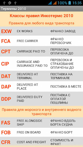 Справочником удобно пользоваться для выбора нужного правила при подготовке коммерческих контрактов, когда надо сориентироваться - какие обязательства, риски и платежи возлагаются на продавца и покупателя при различных условиях поставки товара.