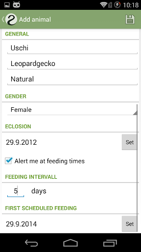- Get informed when you have to feed one of your pets: You can define those times per animal to achieve maximum flexibility. Your phone will now warn you when one of your pets is hungry.