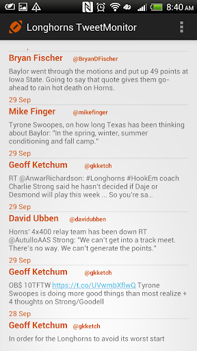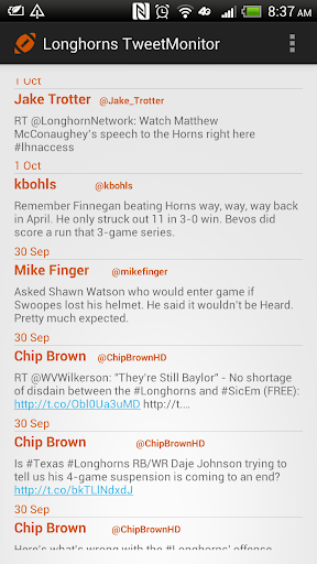 The Texas Longhorns Tweet Monitor is a completely dedicated Twitter app for everything Texas Longhorns! A simple tool to keep up with the latest Texas Longhorns news & online gossip. Built into the app is an extensive list of informative twitter accounts(national media & local beat writers mostly) to follow all about college football! Plus, using the player or coach selection checklist, you'll only receive the tweets that mention that player or coach. The rest are filtered out! That way, you control the amount & content of the tweets you view. Great way to find out what not just what the Texas media are saying but the national media too. Everything is integrated into the app to get up to date Texas Longhorns info. Nothing from your twitter account is needed or asked for. Perfect for someone who doesn't even care to have a twitter account and just wants the latest breaking news! Hook 'em Horns!!!