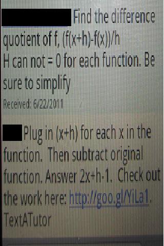 This app gives you access to a math tutor via smartphone via text or email. This service will change the way you get help with your math homework and assignments! All responses come from real qualified tutors with math degrees! We started this app so we can help you with your math!