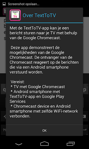 The TextToTV-app let's you text a message to the TV using Google Chromecast. Say Hello to your TV with this simple app! You can fill in a message in the textfield and send this to TV by using the button.
