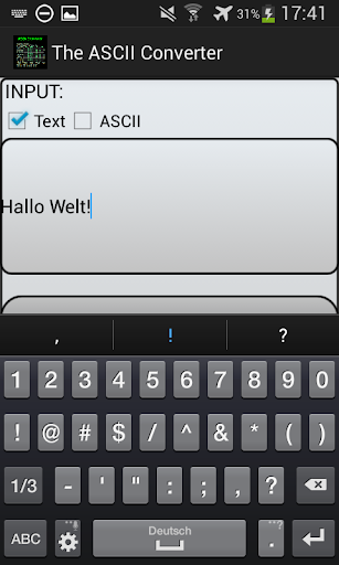 Diese in einfacher Oberfläche gehaltene App, ermittelt wahlweise die jeweiligen dezimalen, binären oder hexadezimalen ASCII-Werte einer Zeichenkette. Eine Umwandlung von ASCII-Codes in die entsprechenden Zeichen, sowie das Kopieren in die Zwischenablage ist ebenfalls möglich.