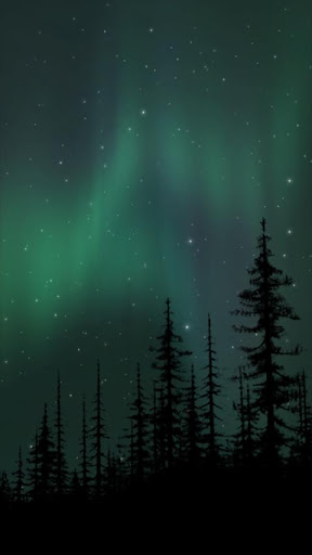 This live wallpaper is the aurora animation like a curtain of the light that appear in the starry night of the coniferous forest.