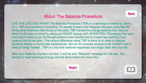 The Balance Procedure (TBP) is a technique created by Jenny Cox. TBP is accessible to everyone, it's simple to learn and integrate into your everyday life. While other methods often focus the past, TBP transforms energy patterns that have an effect on the way we think by using our HEART energy with INTENTION. The energy that was involved in creating our old thought patterns are transformed to create new patterns, thus creating the life we want.