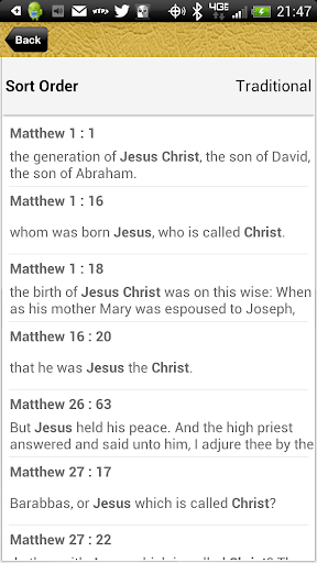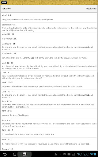 • Search: simple search to look for words or phrases; compound search allows search of any two words or phrase and returns the verse that contain both; search words are bolded in the results, sort traditional or alphabetical