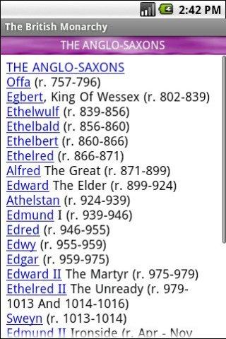 A searchable 1,000-year history of the British Crown contained in this one app. Bios of every monarch from Offa & Kenneth I through Elizabeth II; overviews of each house; Years they reigned, who they killed to get there! What's an OBE? I didn't know, I'm American! Now I do and you can too!!