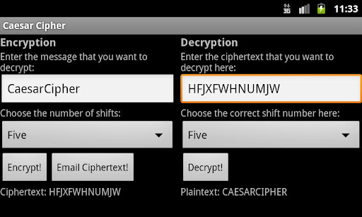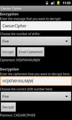 This is the Caesar Cipher App for Android! You can use it to encrypt or decrypt any message you want with the most famous cipher: the Caesar Cipher.