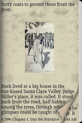 The story opens with Buck, a large and powerful St. Bernard-Scotch Collie,[1][2] living happily in California's Santa Clara Valley as the pet of Judge Miller. He is stolen by the gardener's assistant, however, and sold to fund the latter's gambling addiction. Buck is then shipped to Seattle. Put in a crate, he is unfed and beaten by the "man in the red sweater". When released, he attacks the man but is badly beaten and taught to respect the law of the club. Buck is then sold to a pair of French-Canadian dispatchers from the Canadian government, François and Perrault, who take him with them to the Klondike region of Canada. There they train him as a sled dog. From his teammates, he quickly learns to survive cold winter nights and the pack society. A rivalry develops between Buck and the vicious, quarrelsome lead dog, Spitz. Buck eventually beats Spitz in a fight "to the death". Spitz is killed by the pack after his defeat by Buck and Buck eventually becomes the leader of the team.