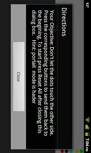 A fun and challenging game to test your hand-eye coordination. Your Objective: Don't let the dots touch the other side. Press the corresponding buttons to send them back to the beginning. If you reach 300 pings on the counter the game is over. You may experience some lagging on older devices.
