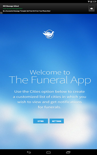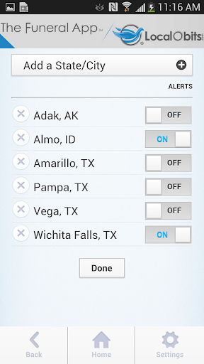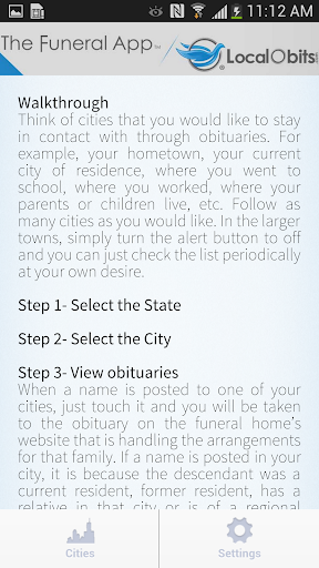 TheFuneralApp is a push notification type app in which users can follow or be notified about the posting of any obituaries to their customized city list. The user can look for an obituary in the city in which they grew up, went to school, worked in, or currently reside...as many cities as the user wishes to follow. You can quickly and easily browse the obituaries for any city within our nation with a single click on your phone. This application is not simply a link to different newspapers. This app links you directly to the appropriate funeral homes’ websites for the full obit and life stories. No longer do you have to subscribe to multiple newspapers, search the web for death notices in multiple cities, or search out funeral home websites to find and read the obits that are important to you. Once you download the Funeral App, you select as many cities as you need or want and you are automatically notified of any new obituary posted to any funeral home’s website within that community. Many of us rely on obituaries to let us know when a distant family member or friend has passed. Obituaries are sometimes the only way we learn of the fallen soldiers that are so near and dear to our hearts. The same is true for those we care about within our own community. This application is free to you and to funeral homes. Contact the funeral homes in your area and encourage them to sign up. It’s easy, it's free and a truly valuable service to all of us.