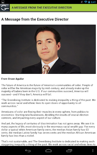 The Greenlining Institute's mission is to empower communities of color and other disadvantaged groups through multi-ethnic economic and leadership development, civil rights, and anti-redlining activities. Our android app now allows you to keep up with the Greenlining Institute right on your device.
