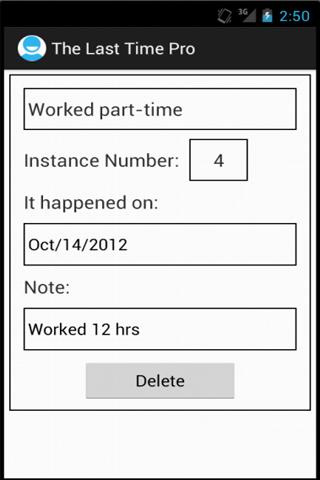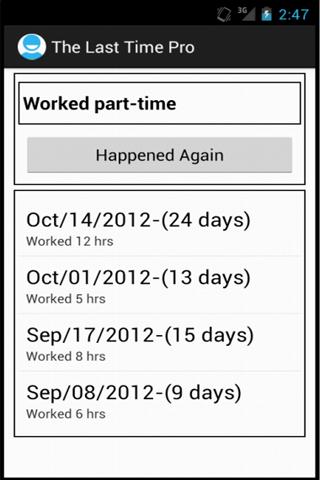 The Last Time allows you to create items and shows you the number of days since that item happened. Also, when the item you created happens again The Last Time will keep a history of all the events of the item. There is also a note option to remember more information about a certain item. Using The Last Time will allow you to track how often and The Last Time something happened.