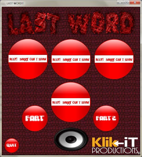 Want to have a funny App on your device that with a press of a button, you'll have the last word!? Then install this App!! Bring to parties or anywhere and have your friends, family or anyone laughing. Includes, passing gas sounds and 4 explicit language sounds done in a funny cartoon voice. Download now and be the first to have The Last Word..!!