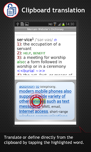 • Easy copy-and-paste functions and the Share button feature (Available for OS 4.0 and higher) allow to copy unknown words from an active application, like web browsers or email, and automatically to open the relevant dictionary entry.