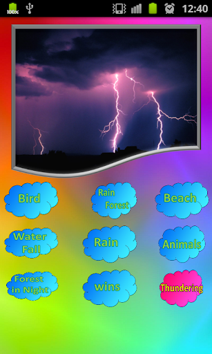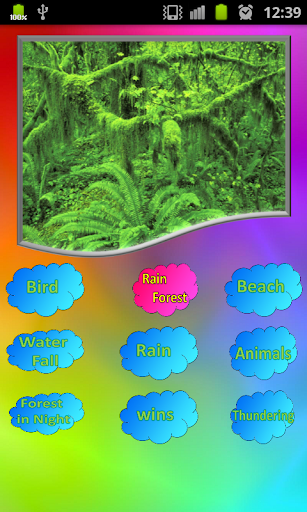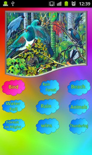 Then choose from a list of 6 different good quality nature relaxing sounds (sounds of nature) which include thunder, ocean sounds, sea, birds sounds, rain, night in jungle, water sounds, waterfall, nature and start your personal audio therapy.
