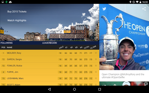 The app is available year round and is updated with the latest news as players qualify for The Open. During the Championship, expect up-to-the-minute live scoring, video highlights and an interactive course guide, accompanied by live golf from The Open and @TheOpen RADIO. Coverage of holes 13, 14 and 15 will be available during the Championship along with @TheOpen LIVE, offering you a unique behind the scenes view at the Home of Golf.