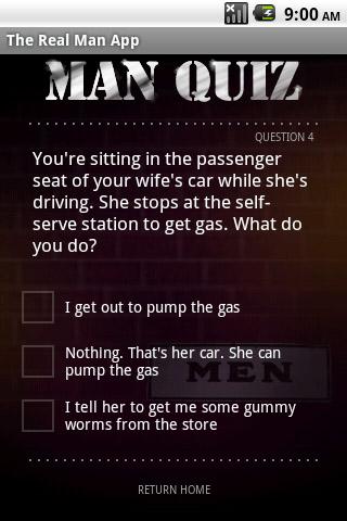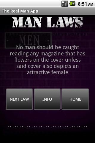 Are you a Real Man? Are you sure? Ladies, are you afraid that your special guy may not be Real Man material? Worry not because The Real Man App was created to separate the men from the weenies…. and there are a lot of weenies out there. The Real Man App features a complete set of Man Laws, manhood testimonials, and a Man Quiz engineered specifically to rate manliness and determine exactly who is a Real friggin’ Man.